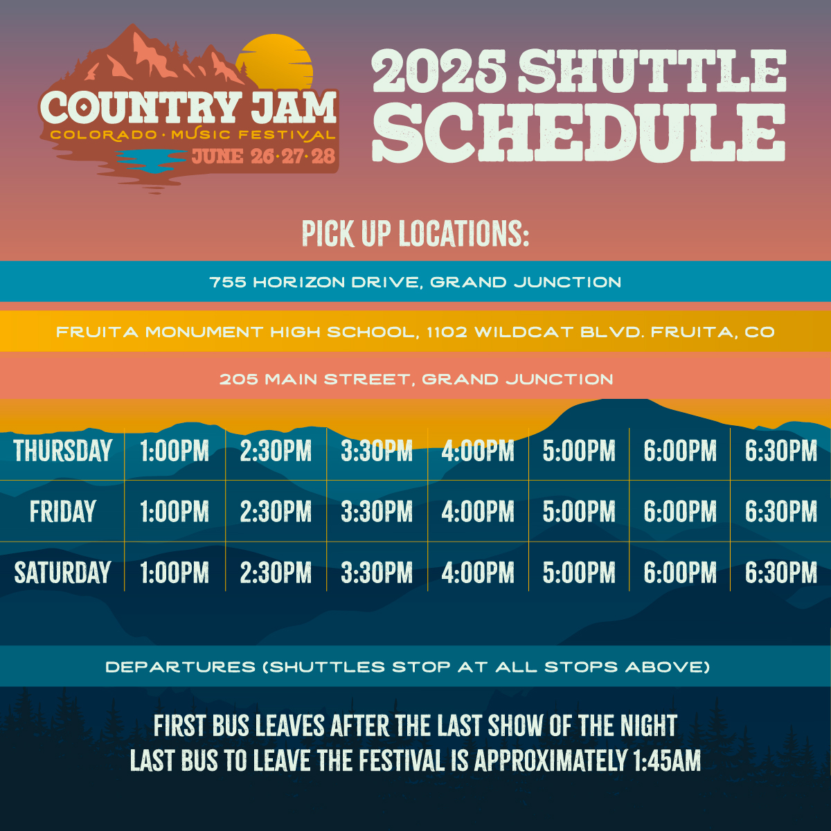 The Official Country Jam Shuttle Bus will pick you up at our set locations and bring you directly to the festival. Shuttles pick up and drop off near the West Gate.